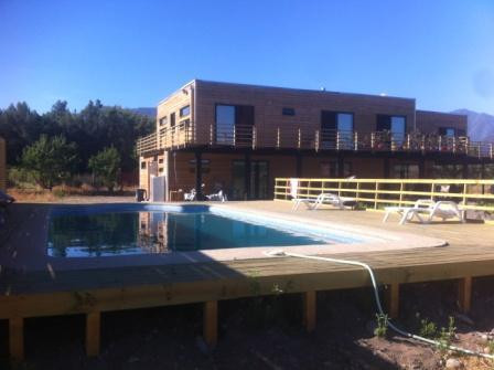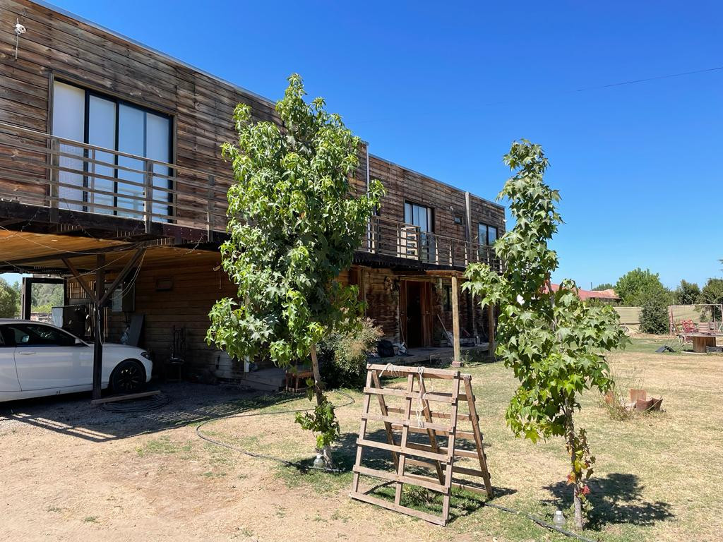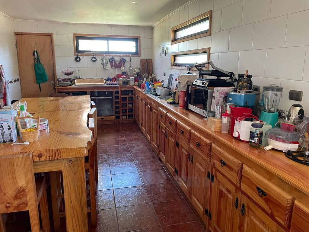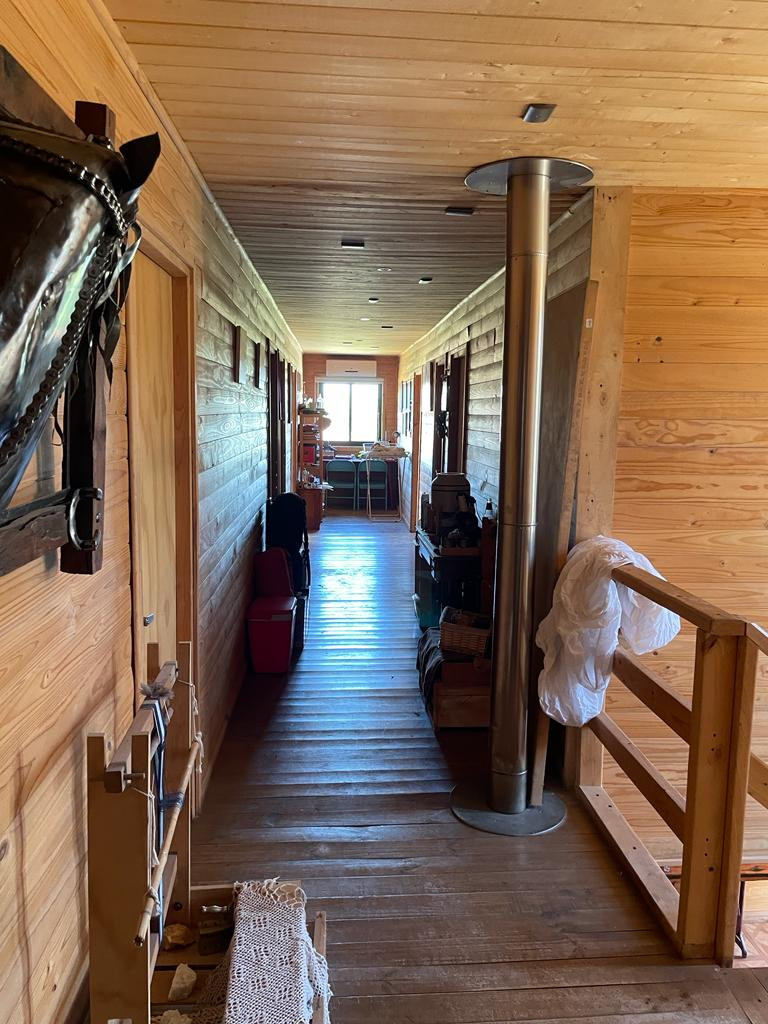Casa de dos pisos de madera, 1° piso hall, living, comedor, estar, 2 dormitorios, baños, cocina amoblada, lavadero. 2° piso 6 dormitorios principal en suite, 3 baños, balcón y terraza. Piscina, bodega, quincho con baño y estufa a leña, pesebreras (120 m2 construidos entre ambas), acceso controlado.
